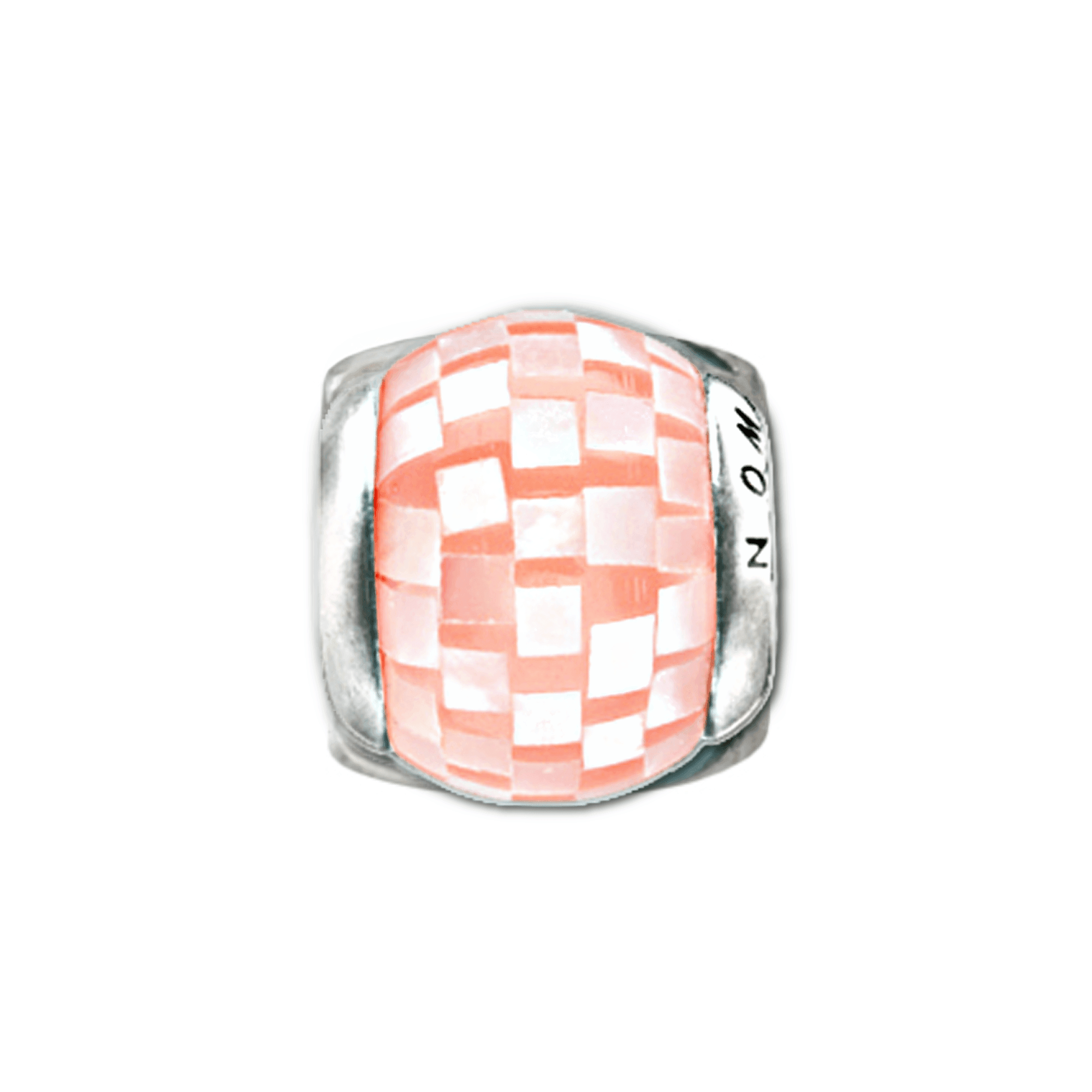 Pearl - Pink This gorgeous mosaic patterned pink mother of pearl encircles the sterling silver core of this spacer that will add depth and beauty to any bracelet.