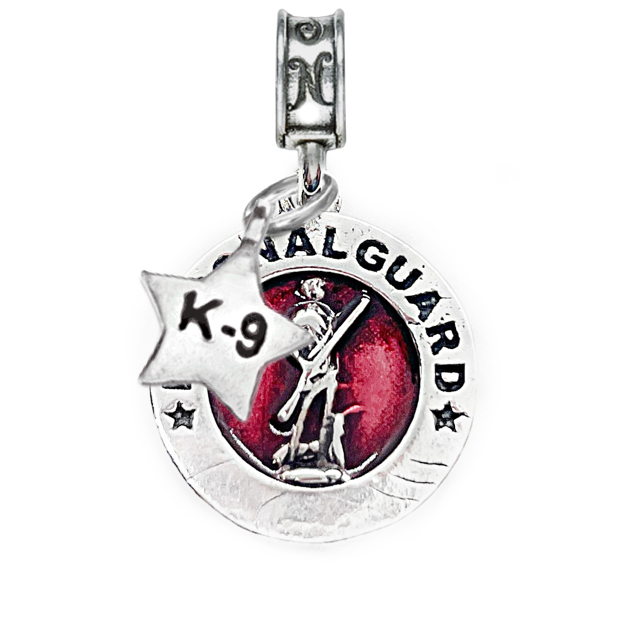 Honor your service or the service of a loved one with our National Guard Emblem. Our .925 sterling silver charm is a 2-dimensional disk rendition of the iconic Minuteman with his plowshare. This symbol appears in the seals of both the Army and Air National Guard.
